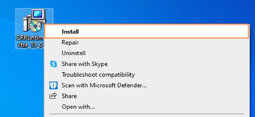 2. กดคลิกขวาที่ไฟล์ CRRuntime_32bit_13_0_20 ที่ดาวน์โหลดมา แล้วกดเลือก Install เพื่อทำการติดตั้ง