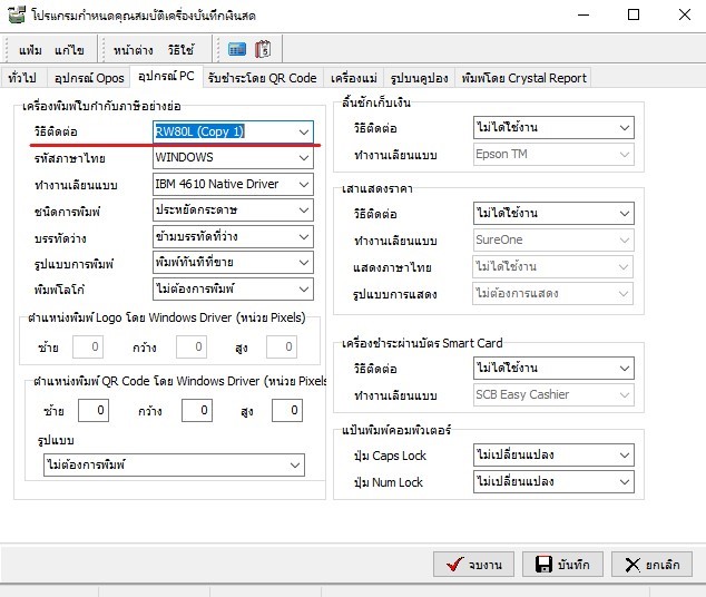 - ช่อง วิธีติดต่อให้เลือกเครื่องปริ้นบิลที่ออนไลน์ ในตัวอย่างจะเป็น RWL80 (Copy 1)