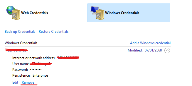 ไปที่ Control Panel → Credential Manager → Windows Credentials แล้วลบรายการที่ตรงกับ IP/ชื่อเครื่องที่แชร์