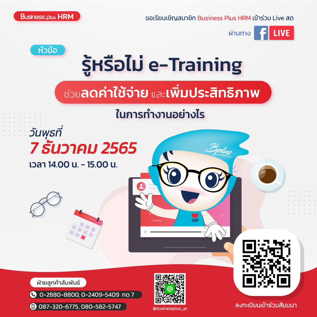ขอเรียนเชิญสมาชิก Business Plus HRM เข้าร่วมรับชม Live สด ผ่าน Facebook ในหัวข้อ : รู้หรือไม่ e-Training ช่วยลดค่าใช้จ่าย และเพิ่มประสิทธิภาพในการทำงานอย่างไร