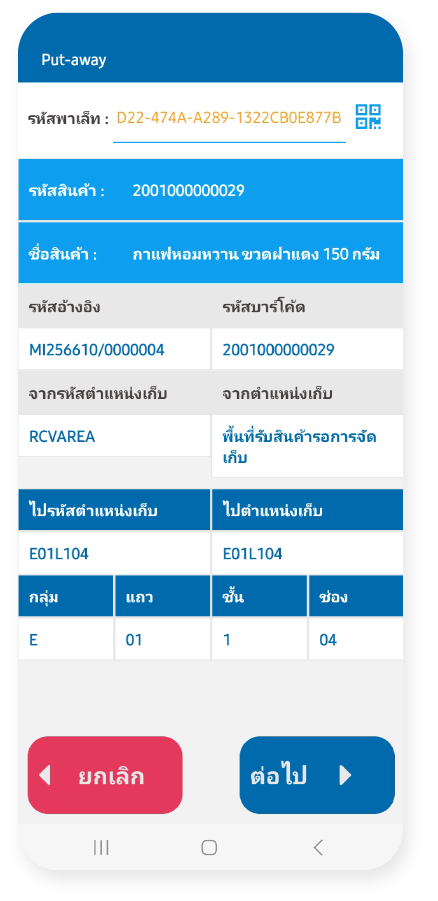 - ควบคุมได้ว่าสินค้าเป็นการจัดเก็บทั้งพาเลท หรือ เก็บเป็นเศษ และสามารถแยกที่เก็บได้