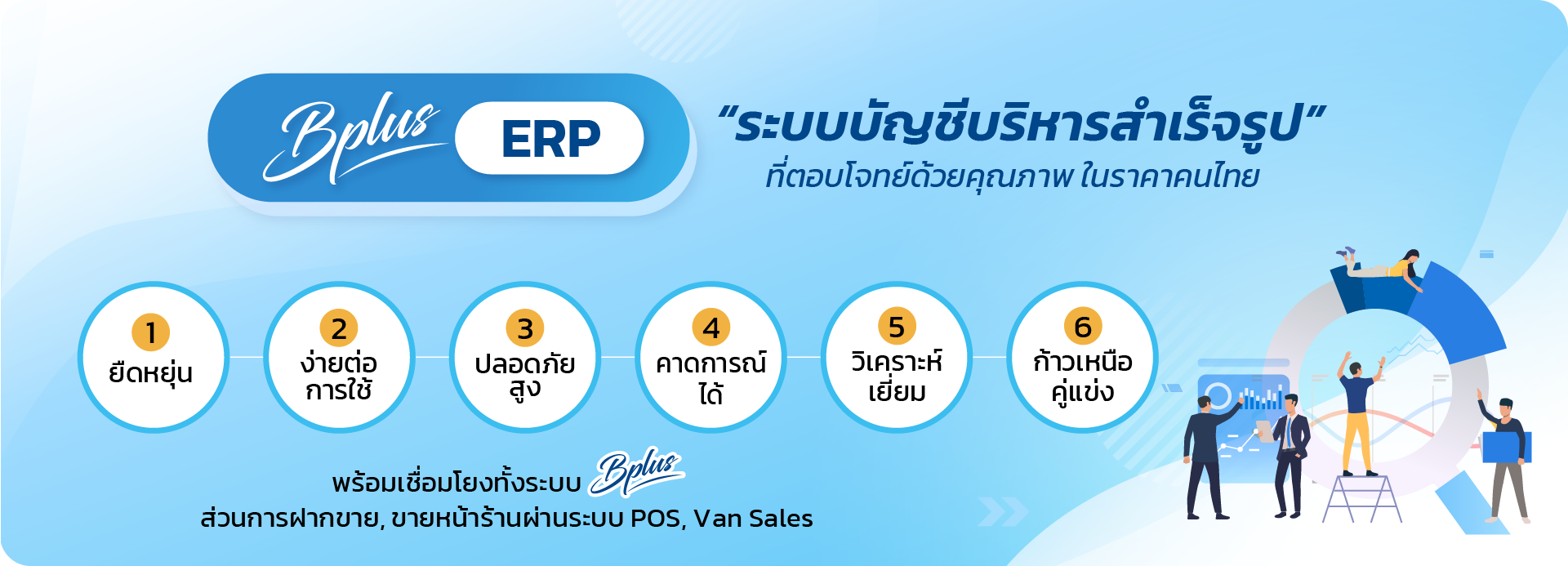 ซอฟต์แวร์ระบบบริหารงานค้าปลีก-ค้าส่ง Bplus POS ช่วยงานขายหน้าร้าน คิดเงิน ถูกต้อง รวดเร็ว ครอบคลุมการขาย เรื่องโปรโมชั่น ลดแลก แจกแถม สมาชิกออนไลน์ สะสมแต้ม e-coupon แลกแต้ม(redeem) แบบคำนวณอัตโนมัติ ช่วยแคชเชียร์สร้างความสัมพันธ์กับลูกค้า เช่นถ้าลูกค้าซื้อและส่งรายการมาคิดเงินแคชเชียร์สามารถบอกลูกค้าได้ว่าตอนนี้มีโปรโมชั่น หรือซื้อกี่ชิ้นจะได้ส่วนลด เป็นต้น สรุปรายงาน สรุปพฤติกรรมการขายของแคชเชียร์ และรายงานวิเคราะห์สำหรับผู้บริหารอีกมากมาย Bplus ยังช่วยควบคุมสต็อกสินค้าของสำนักงานใหญ่และสาขาได้ เชื่อมโยงระบบบัญชีบริหารงานหลังร้าน Bplus ERP ได้ทันที