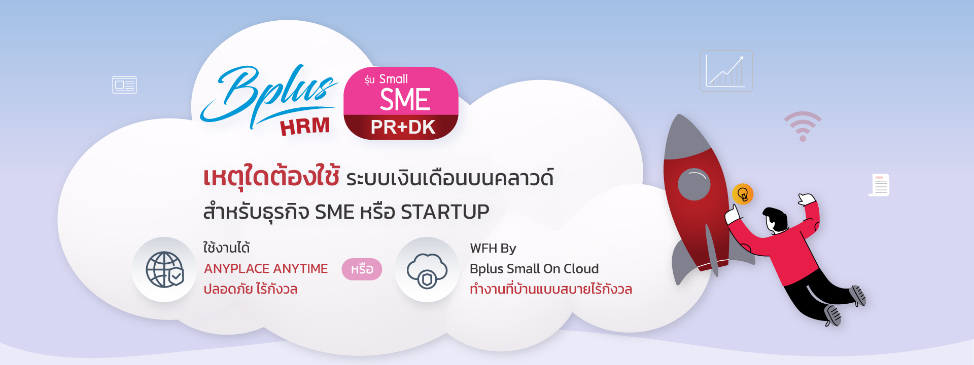 โปรแกรมเงินเดือนสำเร็จรูป Bplus Small On Cloud สำหรับใช้งานเครื่องเดียว รุ่น Small SME (จำกัดพนักงานไม่เกิน 50 คน) แบบเช่า เป็นรุ่นภาษาไทย ประกอบด้วย PR : Payroll ระบบเงินเดือนค่าแรงพนักงานพร้อมระบบ DK : Disk Transfer ระบบที่เตรียมข้อมูลในรูปแบบของสื่อส่งข้อมูลผ่าน Internet เพื่อนำส่งยังกรมสรรพากรและสถาบันการเงิน