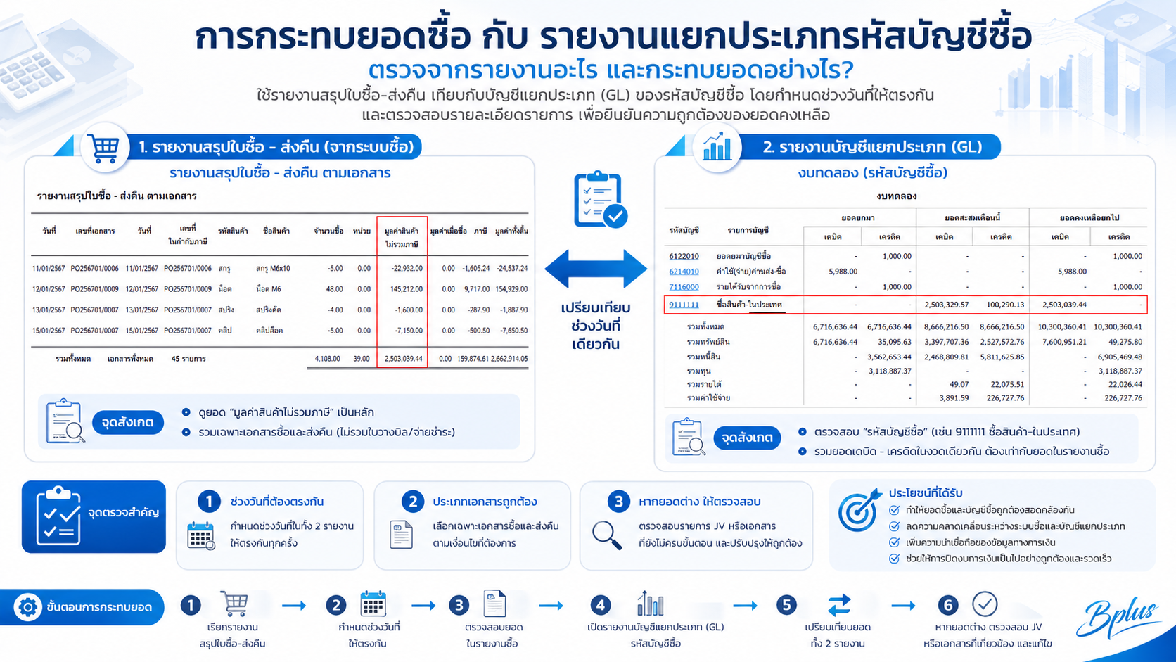 เพื่อให้สามารถตรวจสอบและกระทบยอดระหว่างรายงานยอดซื้อจากระบบงานซื้อ กับบัญชีแยกประเภทรหัสบัญชีซื้อ (GL) หรือ งบทดลอง ได้อย่างถูกต้องและสอดคล้องกัน