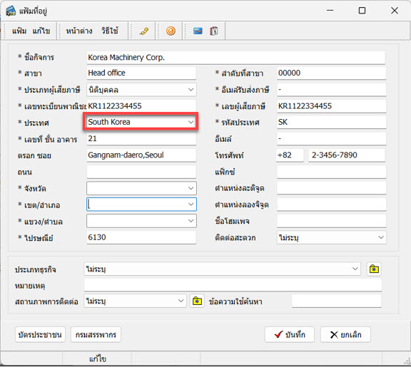 รวมถึงกรณี ต้องการเพิ่มแฟ้มประวัติเจ้าหนี้ และลูกหนี้ต่างประเทศ การกำหนดที่อยู่จะทำอย่างไร เนื่องจากมีข้อมูลประเทศให้เลือก เพียงประเทศไทย