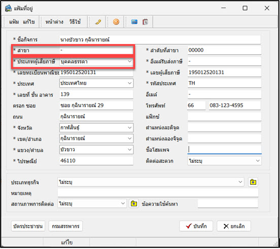 1.2 กรณีต้องการกำหนดแฟ้มที่อยู่ ทั้งเจ้าหนี้ และลูกหนี้ ที่เป็นบุคคลธรรมดา สามารถเลือกแถบ *ประเภทผู้เสียภาษี เป็น บุลคลธรรมดา