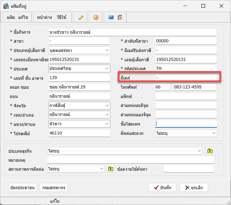 และสำหรับช่องอีเมล ซึ่งจะไม่มีเครื่องหมาย * ด้านหน้า สามารถใส่ - แทนค่าว่าง จากนั้นกดบันทึก