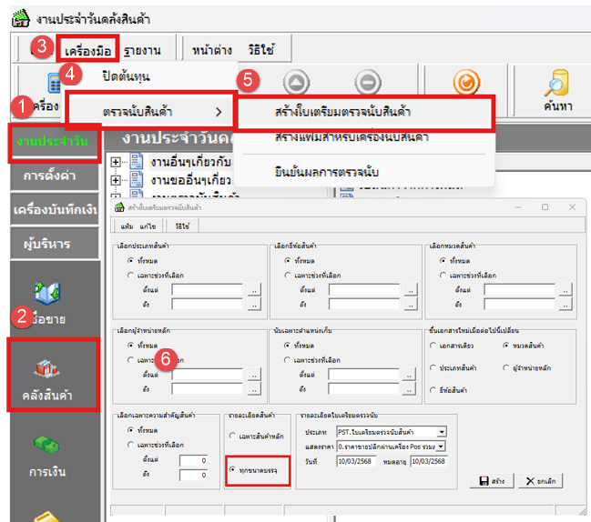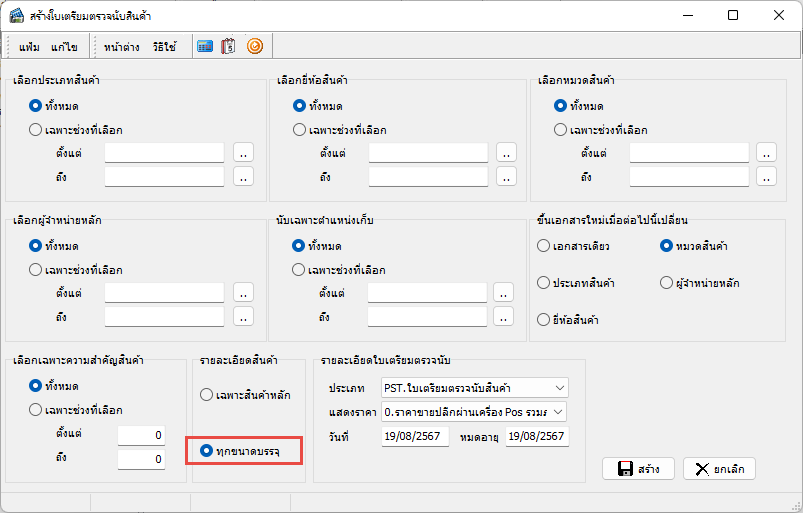 สามารถทำได้ โดยการเลือกเครื่องมือเตรียมตรวจนับสินค้านั้น ให้ทำการติ๊ก ส่วนรายละเอียดสินค้า เลือกช่อง ทุกขนาดบรรจุ เมื่อกดบันทึก ระบบจะดึงทุกขนาดบรรจุของสินค้าที่เลือกมาแสดงให้ในเอกสารเตรียมตรวจนับ