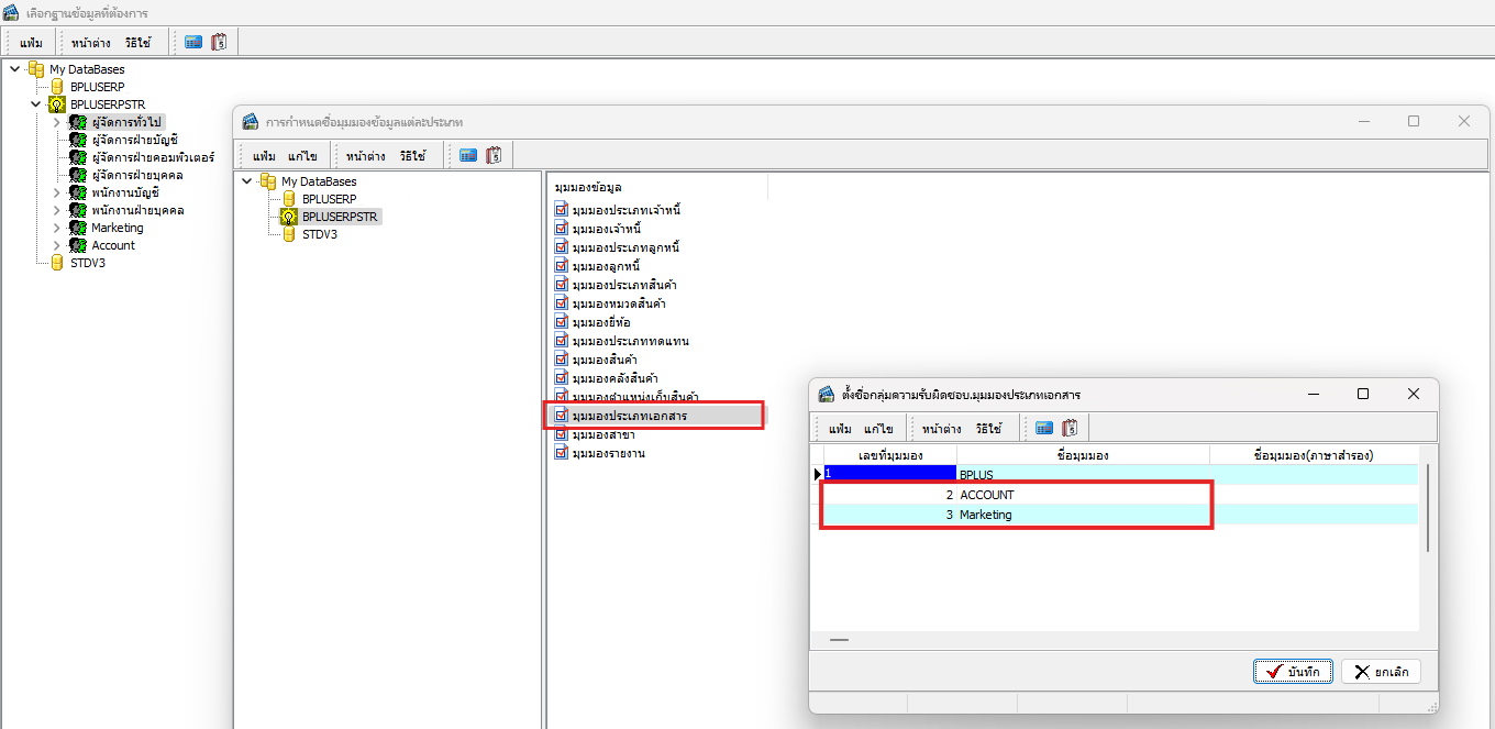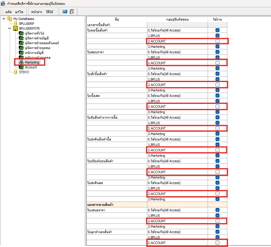 จากนั้นให้เข้าไปกำหนดสิทธิ์การบันทึกเอกสารตามตำแหน่งหน้าที่ ที่การกำหนดสิทธิ์ตามมุมมอง เช่น ฝ่าย Marketing ต้องการไม่เห็นเอกสารของฝ่าย Account ให้ติ๊ก เครื่องหมายถูกออกทั้งหมด ที่เป็นช่องของฝ่าย Account