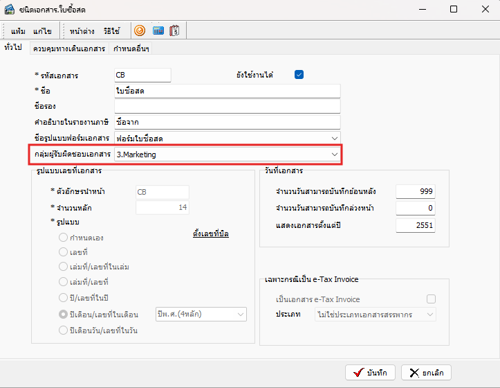จากนั้นเข้าไปที่ระบบเอกสารจะต้องแยกประเภทเอกสารตามแผนกเบื้องต้นก่อน เช่น เอกสารขายสำหรับฝ่ายขาย1, สำหรับฝ่ายขาย 2 หลังจากนั้นให้กำหนดสิทธิกลุ่มผู้รับผิดชอบเอกสาร จะแสดงสิทธิที่เราสร้างให้กำหนด ให้ผูกระหว่างสิทธิกับระบบเอกสาร ถือเป็นการตั้งค่ากลุ่มผู้รับผิดชอบเรียบร้อย