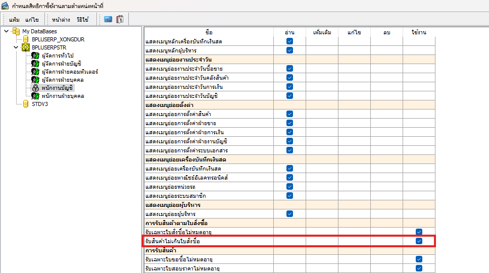 เข้าไปเปิดสิทธิได้ที่ กำหนดสิทธิตามตำแหน่งหน้าที่ > การรับสินค้าตามใบสั่งซื้อ ติ๊กถูกออก ที่ช่องรับสินค้าไม่เกินใบสั่งซื้อ แล้วกลับเข้าไปบันทึกรับอีกครั้งจะสามารถแก้ไขจำนวนเกินใบสั่งซื้อได้เรียบร้อย โดยขั้นตอนการกำหนดสิทธิจะสามารถสามารถใช้ได้ทั้ง V2.9 และ V3