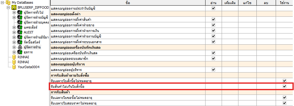 A:ฺBusiness Plus ERP สามารถกำหนดสิทธิห้ามรับเกินใบสั่งซื้อได้ หากต้องการรับเกิน ต้องให้ผู้มีอำนาจทำการเปิดสิทธิการใช้งานให้สามารถใช้งานได้