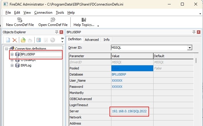 - เปิดโปรแกรม โปรแกรมตั้งค่าเชื่อมโยงฐานข้อมูล(FiredacAdmin) โดยปกติจะอยู่บนหน้า Desktop โดยเมื่อเปิดแล้วจะพบหน้าต่าง Firedac Admin ดังภาพ ให้ตรวจสอบโดย ฝั่งด้านซ้ายจะแสดงชื่อฐานข้อมูลที่ใช้งาน ให้คลิกเลือกฐานข้อมูลที่ใช้ จะแสดงรายละเอียดทางข้อมูลฝั่งด้านขวา ในส่วนของการตั้งค่า Server จะแสดงเลข IP Address ของเครื่อง Server โดยจากตัวอย่าง IP Address จะเป็น 192.168.0.156