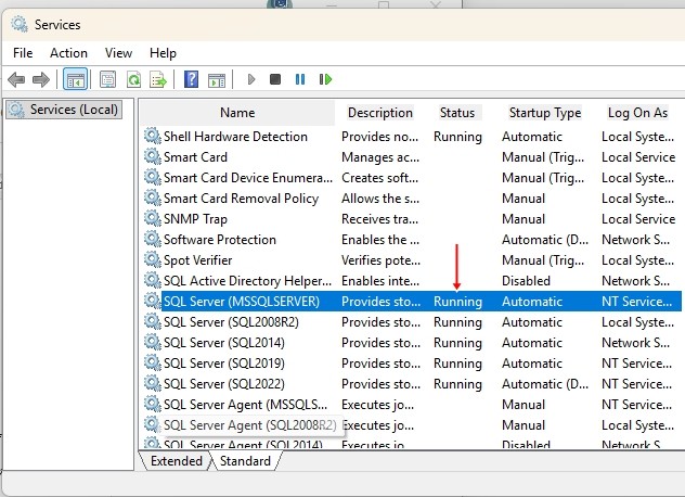 - จะพบหน้าต่าง Service ให้ตรวจสอบ Service ที่ชื่อ SQLServer (MSSQLxxxxx) ตัวอย่างตามภาพ