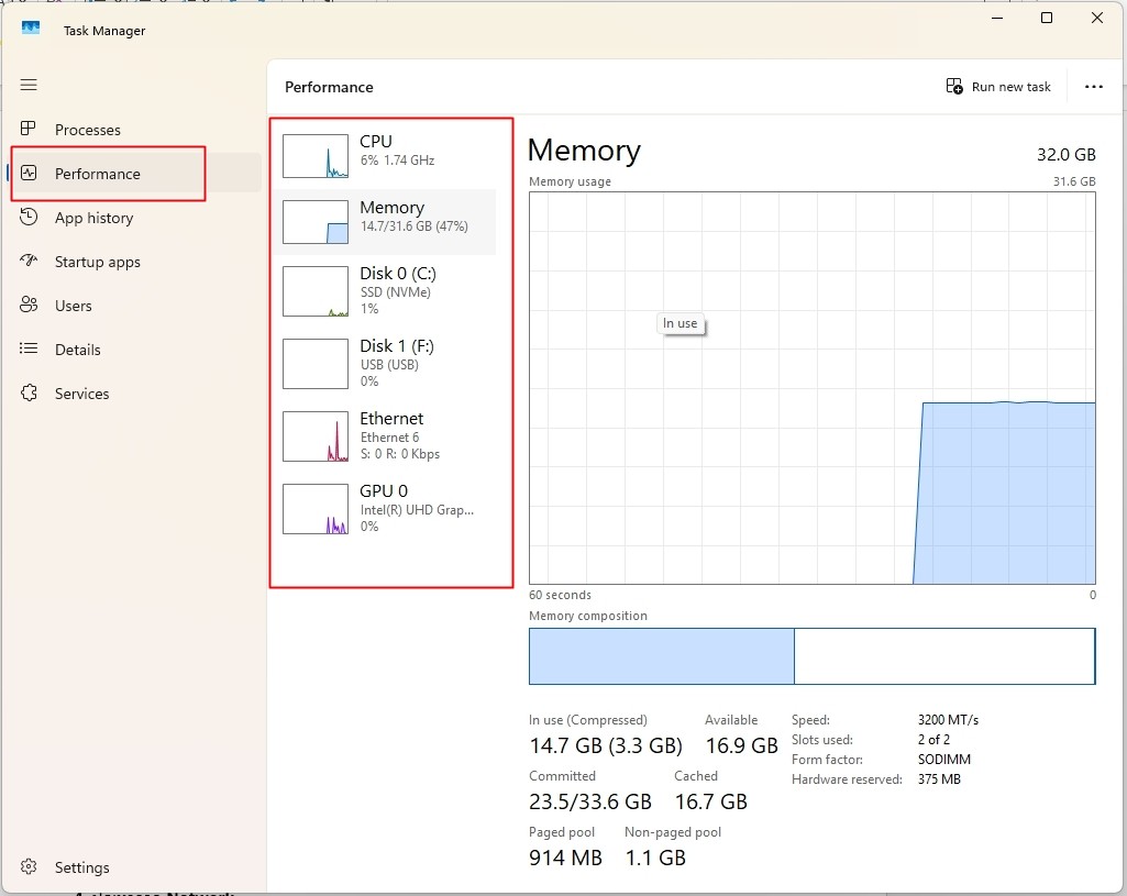 - จะพบหน้าต่าง Task Manager ให้ตรวจสอบในส่วน Performance ซึ่งจะแสดงสถานะของส่วนต่างๆ เช่น CPU Usage, Ram Usage , HDD Usage เป็นต้น ตัวอย่างดังภาพ