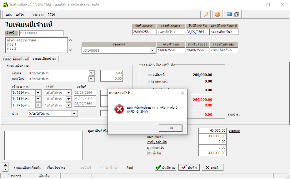 Q: บันทึกเอกสารงานการเงิน ใบเพิ่มหนี้เจ้าหนี้ เมื่อกดรวมยอด ต้องการบันทึกเอกสาร ระบบแจ้ง Error APD_G_SNV ทำให้บันทึกเอกสารไม่ได้ต้องแก้ไขอย่างไร