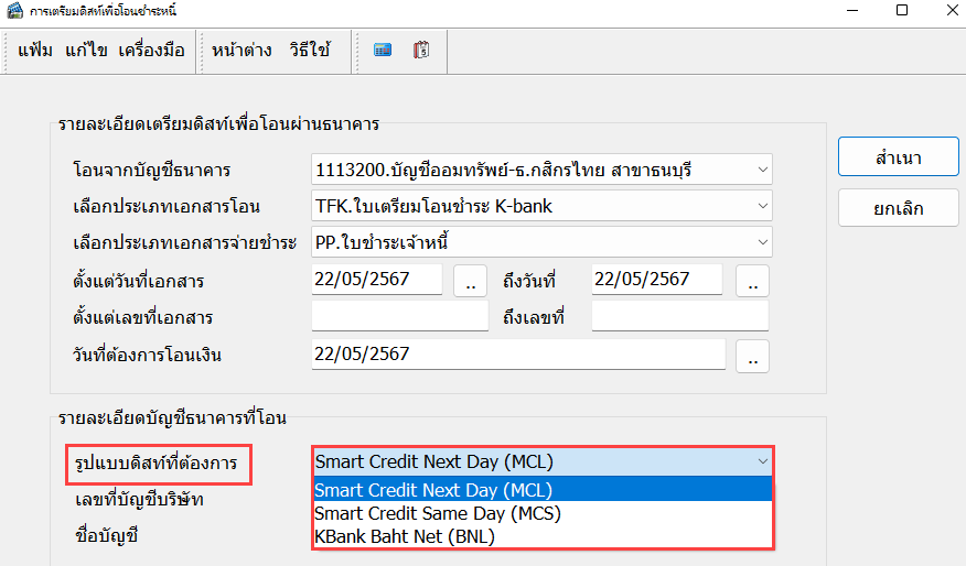 - ลดขั้นตอนการทำงานซ้ำซ้อน หลังจากโอนชำระหนี้ผ่านธนาคาร โปรแกรมจะสร้างเอกสารจ่ายชำระหนี้ให้อัตโนมัติ