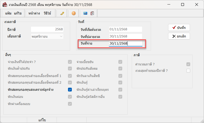 Q : กรณีคำนวณแล้ว วันที่จ่ายในโปรแกรมไม่ตรงกับวันที่จ่ายจริง ทำอย่างไร