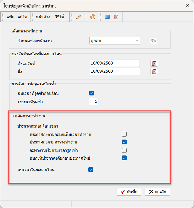 วิธีแก้ไข ให้เปลี่ยนกะไม่คงที่ใหม่ และตอนโอนเข้ากะให้เอาติ๊กถูกตรงการจัดการกะทำงานออกให้หมดค่ะ