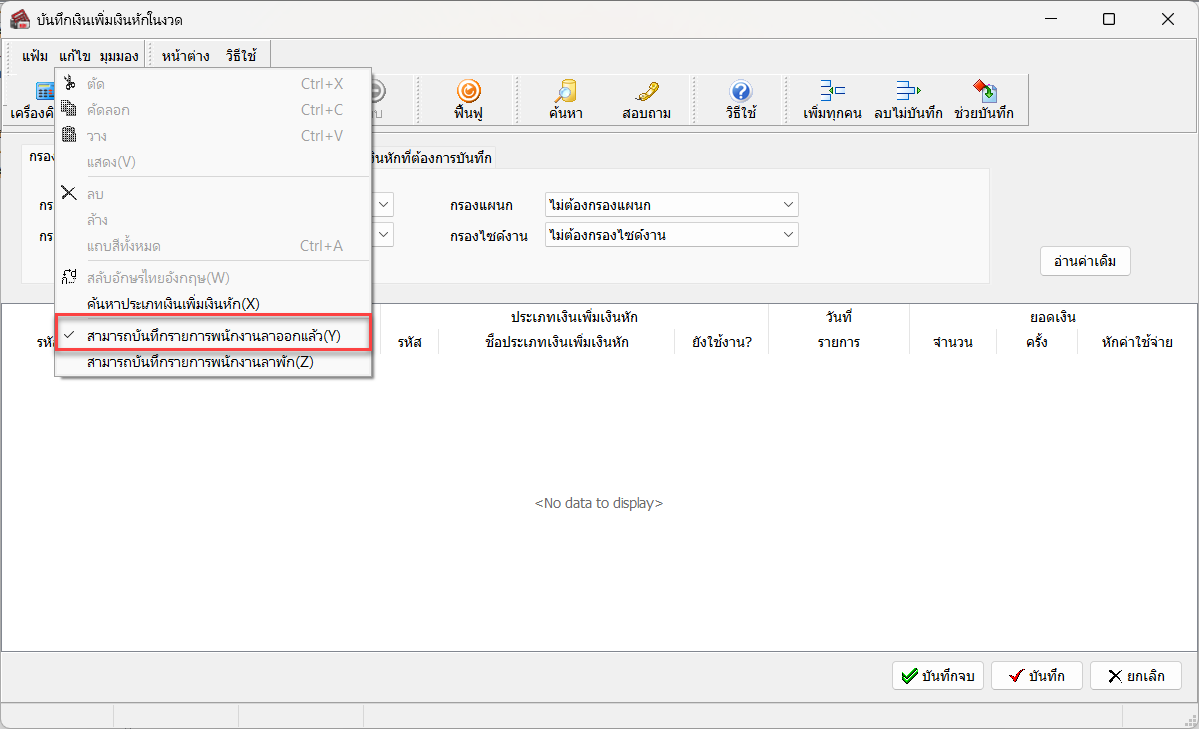 Q : ต้องการบันทึกเงินเพิ่มเงินหัก ให้กับพนักงานลาออก แต่หาชื่อพนักงานที่ต้องการบันทึกไม่เจอ ทำอย่างไร