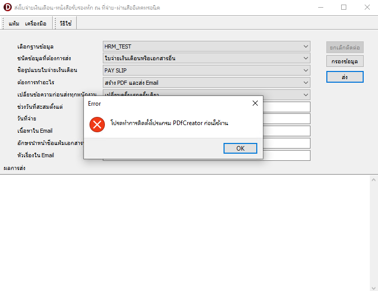 กรณีที่ 1 ส่ง E-Payslip และโปรแกรมแจ้งว่า โปรดทำการติดตั้งโปรแกรม PDFCreator ก่อนใช้งาน