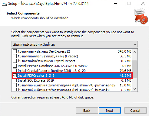 กรณีใช้งาน BplusHRM Version 7.4 สามารถติดตั้ง PDFCreator ผ่านตัวติดตั้ง BplusHRM 7.4 ได้เลย โดยหน้าจอการติดตั้งเลือกติดตั้งเฉพาะ PDFCreator ตามภาพ หลังจากติดตั้งเรียบร้อยแล้วดำเนินการส่งใหม่อีกครั้ง