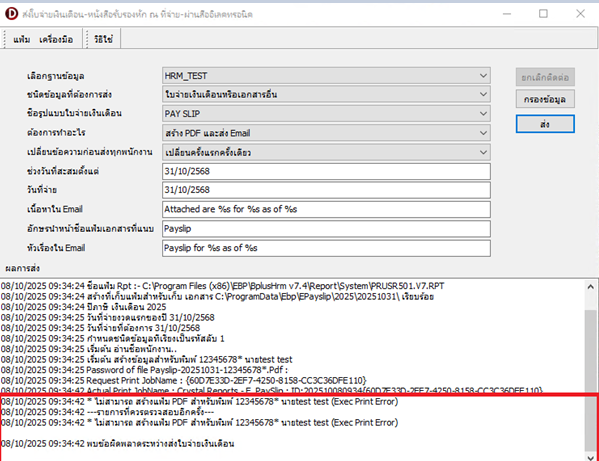 กรณีที่ 2 ส่ง E-Payslip และโปรแกรมแจ้งว่า ไม่สามารถสร้างแฟ้ม PDF สำหรับพิมพ์ (Exec Print Error)