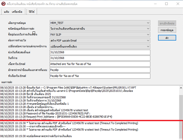 กรณีที่ 3 ส่ง E-Payslip และโปรแกรมแจ้งว่า ไม่สามารถสร้างแฟ้ม PDF สำหรับพิมพ์ (Timeout To Completed Printing)