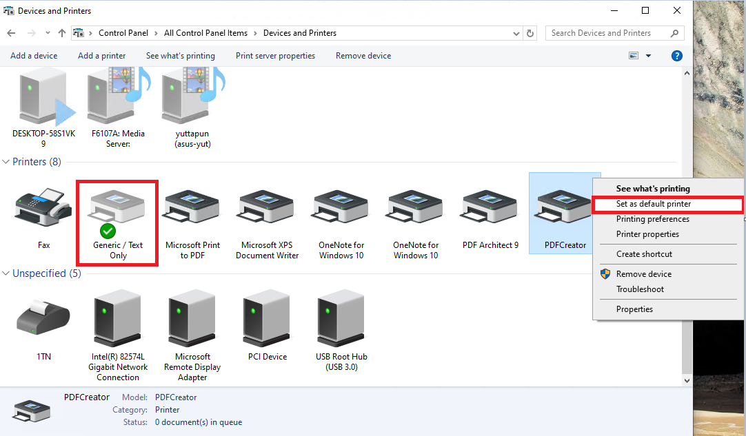ตรวจสอบเบื้องต้นว่า Default Printer ที่ใช้งานอยู่ในสถานะ Offline หรือ เปลี่ยน Default Printer ที่ตั้งค่าไว้เป็น PDFCreator แทน และส่งใหม่อีกครั้ง โดยไปที่เมนู Control Panel -> Devices and Printers -> ดำเนินการตั้งค่า Default Printer เป็นเครื่องอื่น ๆ ที่ Online อยู่ หรือ ตั้งค่า Default Printer เป็น PDFCreator และส่งใหม่อีกครั้ง