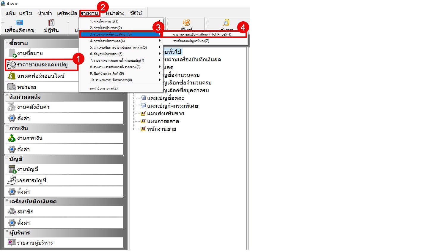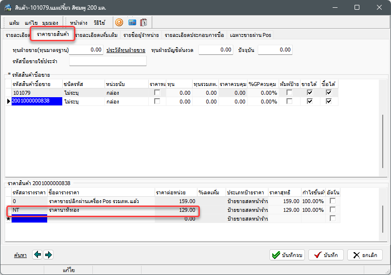 ไปที่เมนู ราคาขายและแคมเปญ > ราคาขายผ่านเครื่องบันทึกเงินสด > ราคานาทีทอง