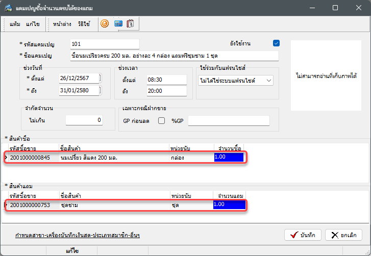 ที่เมนูงานซื้อขาย > ราคาขายและแคมเปญ > แคมเปญซื้อจำนวนครบ > ซื้อจำนวนครบได้ของแถม