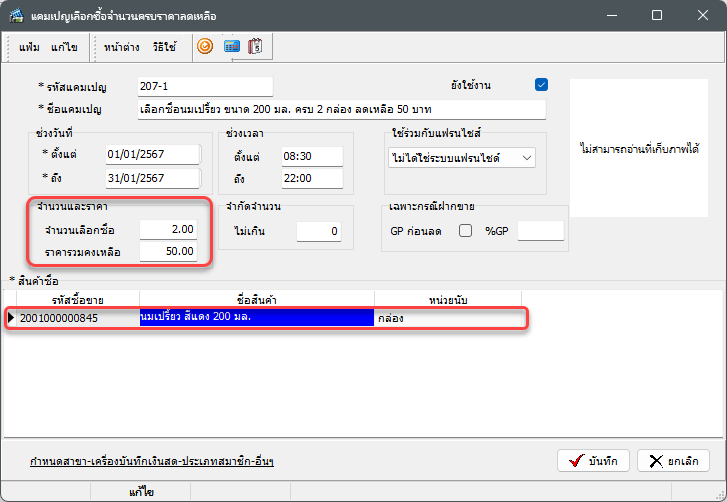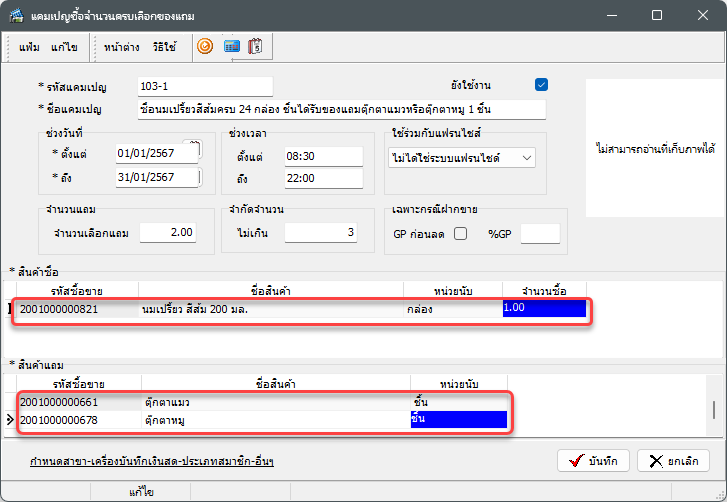 ที่เมนูงานซื้อขาย > ราคาขายและแคมเปญ > แคมเปญซื้อจำนวนครบ > ซื้อจำนวนครบเลือกของแถม