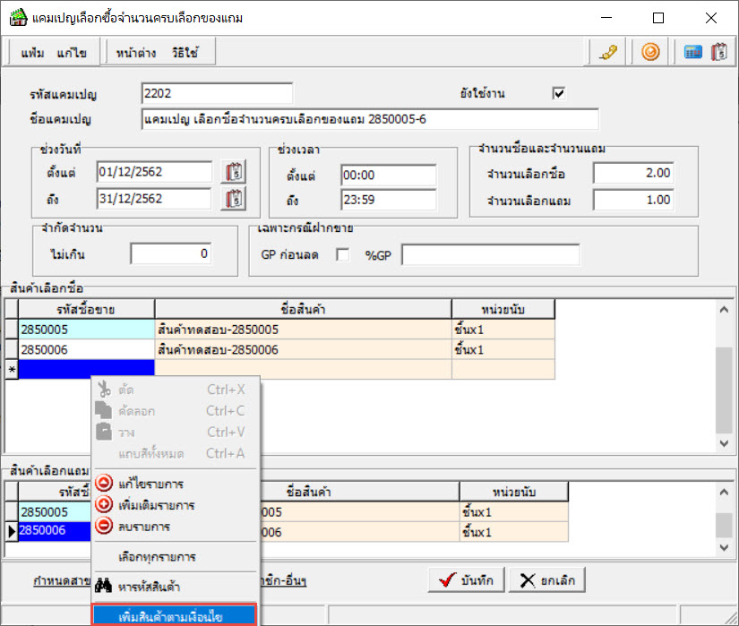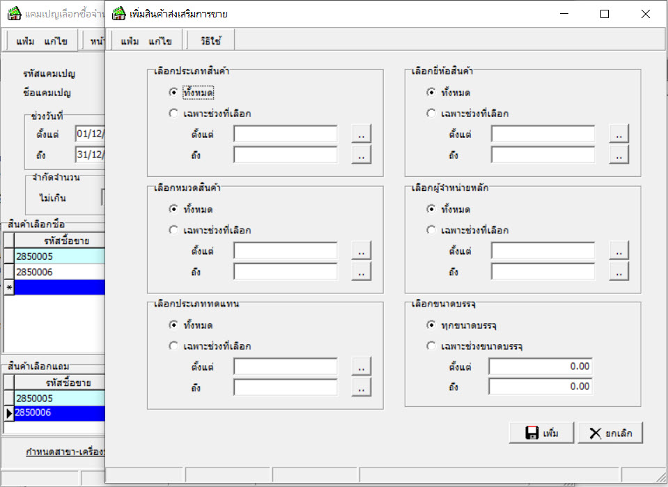 สามารถเลือกเงื่อนไข ตามช่วงรหัสยี่ห้อสินค้า ตั้งแต่ - ถึง เบื้องต้นได้ เมื่อทำการกดปุ่มเพิ่มสินค้า รายการสินค้าตามยี่ห้อที่เลือกจะถูกบันทึกในแคมเปญนี้