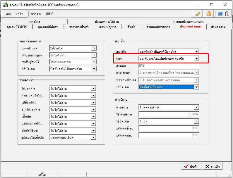 - กำหนดคุณสมบัติเครื่องบันทึกเงินสด ส่วนของราคาขายสมาชิก ให้ระบบมองจาก % ส่วนลดที่กำหนดในแฟ้มประเภทสมาชิก