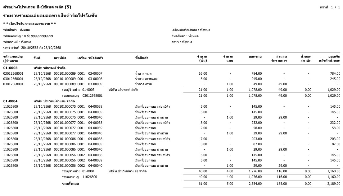 ตัวอย่างรายงานรายละเอียดยอดขายสินค้าจัดโปรโมชั่น