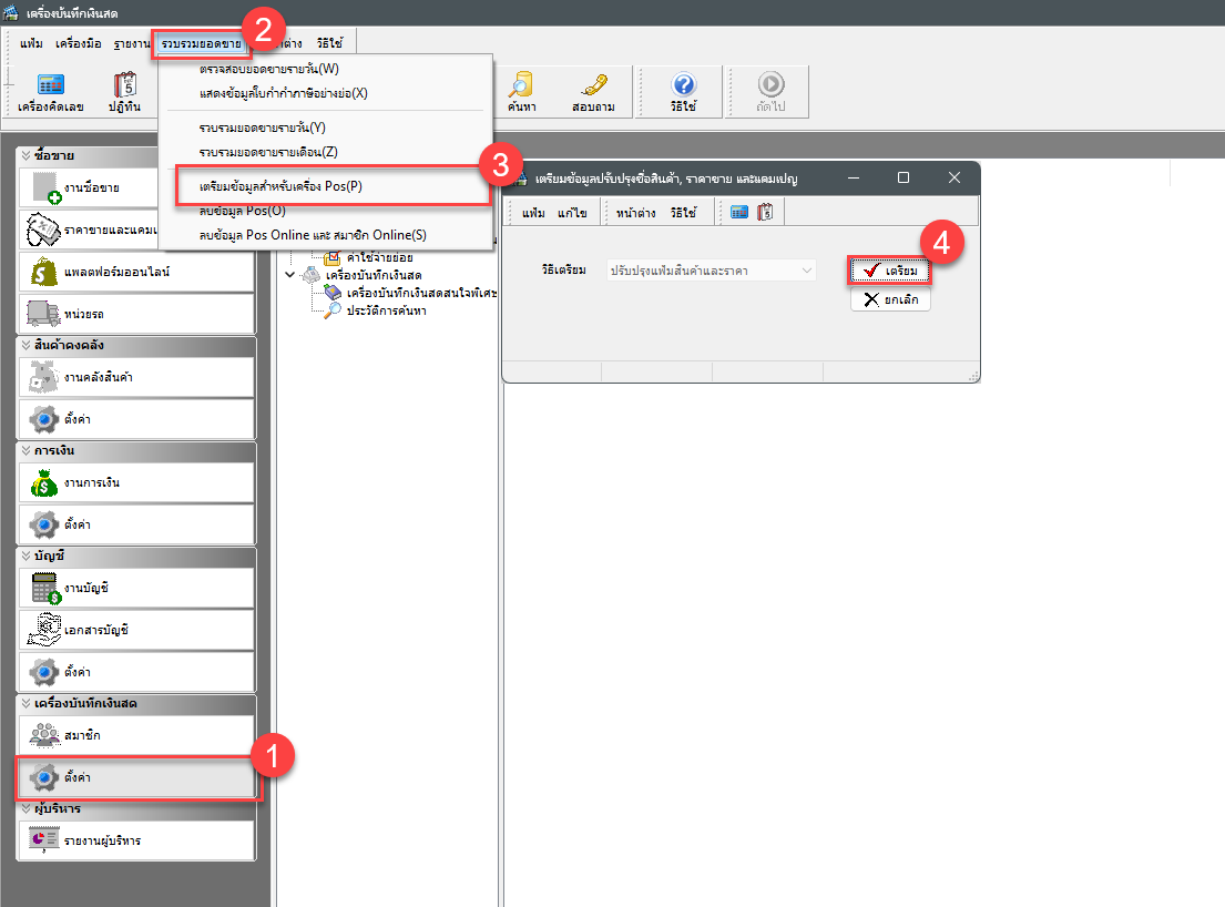 เครื่องบันทึกเงินสด → รวบรวมยอดขาย → เตรียมข้อมูลสำหรับเครื่องบันทึกเงินสด