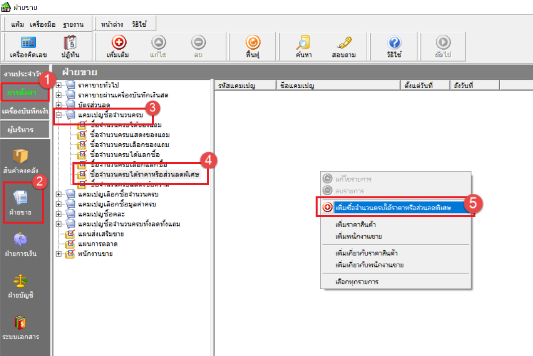 > การตั้งค่า > ฝ่ายขาย > แคมเปญซื้อจำนวนครบ > ซื้อจำนวนครบได้ราคาหรือส่วนลดพิเศษ