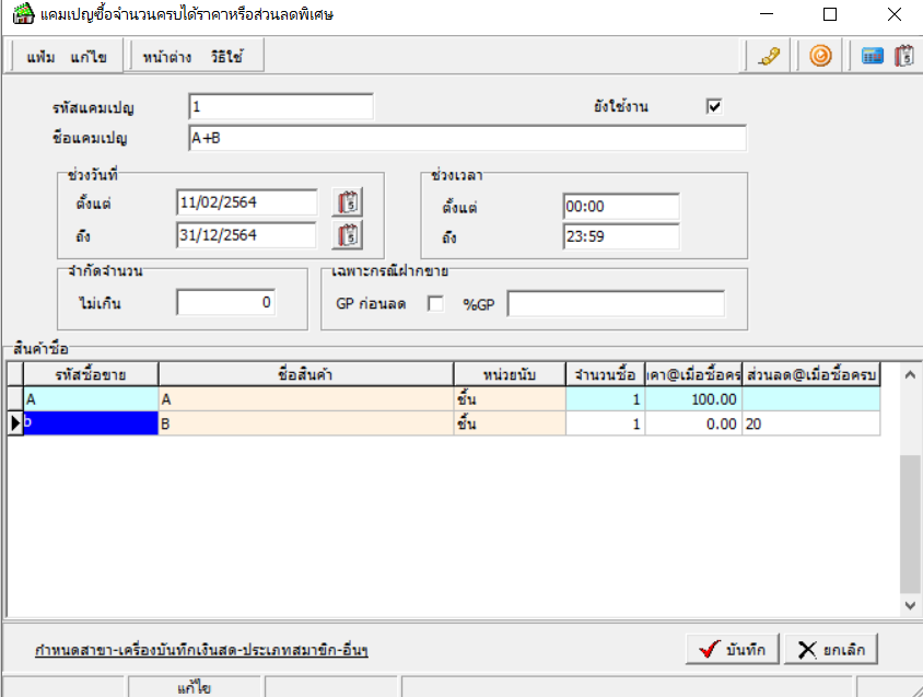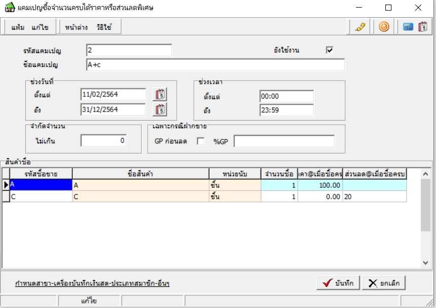 สินค้าซื้อ ใส่รหัสสินค้าที่ต้องซื้อ, จำนวนที่ต้องซื้อ, ใส่ราคาที่ต้องซื้อ หรือใส่ส่วนลดเมื่อซื้อครบจำนวนที่ระบุ