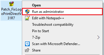 2. ทำการติดตั้งไฟล์ “Patch_FixLogoPrintDirectV31R7.exe” โดยการคลิกขวากดเลือก “Run as administrator”