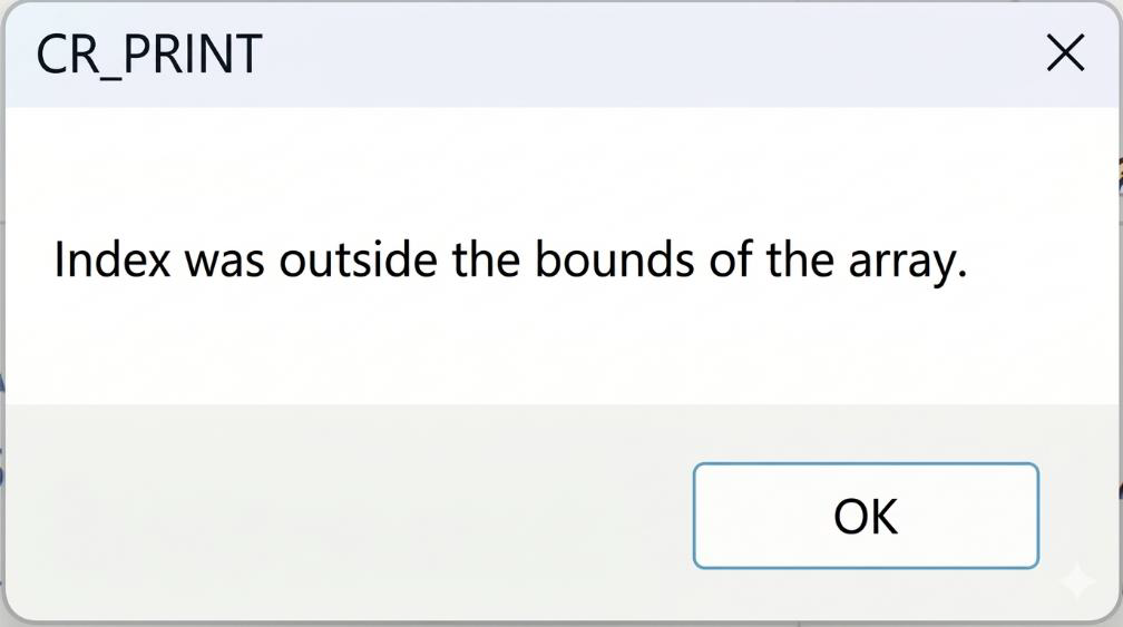 สาเหตุ: เกิดจากการทำงานของ CR_PRINT ไม่สามารถประมวลผลข้อมูลบางส่วนได้ จึงไม่สามารถพิมพ์รายงานได้ และแสดงข้อความดังกล่าว
