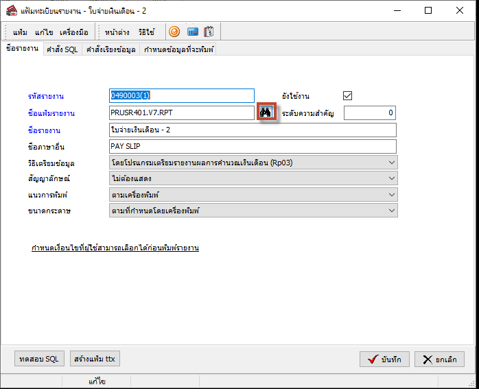 ***ต้องไม่ทำการติ๊กทั้งช่อง No Printer และ ช่อง Dissociate... จากนั้นทำการกด OK และทำการกด Save เพื่อบันทึกไฟล์รายงาน