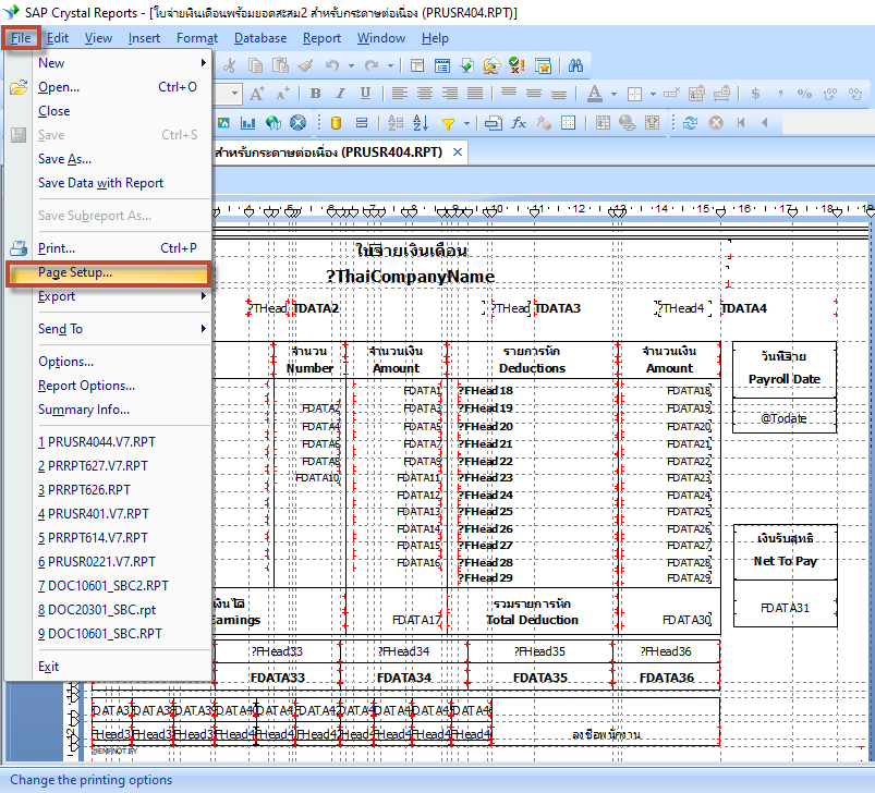 - ทำการเปิดไฟล์รายงานด้วยโปรแกรม SAP Crystal Report > เลือก File > เลือก Page Setup