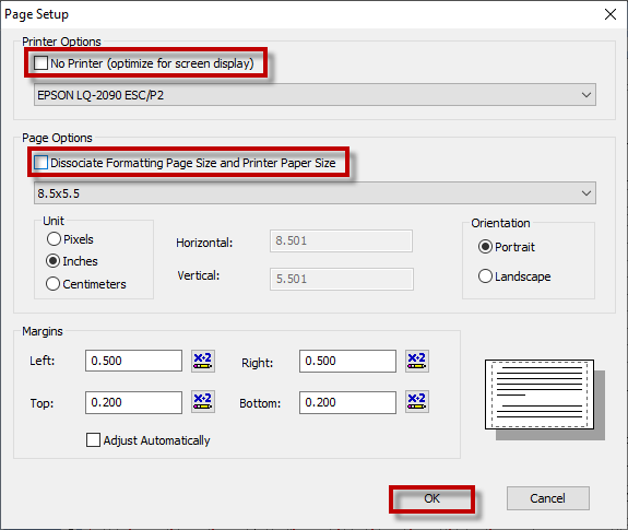 - แถบเมนู Page Option ในช่อง Dissociate Formatiion Page Size and Printer หากทำการติ๊กไว้ ให้เอาติ๊กออก