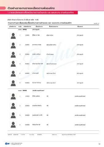 ตัวอย่างรายงานรายละเอียดตามผังองค์กร 1. รายละเอียดแสดงชื�อพนักงานตามตําแหน่ง และ แผนกงาน ตามผังองค์กร ิ ี ั ิ บรษท อ-บซเนส พลส จำกด ั ิ ั E-BUSINESS PLUS CO., LTD. 53