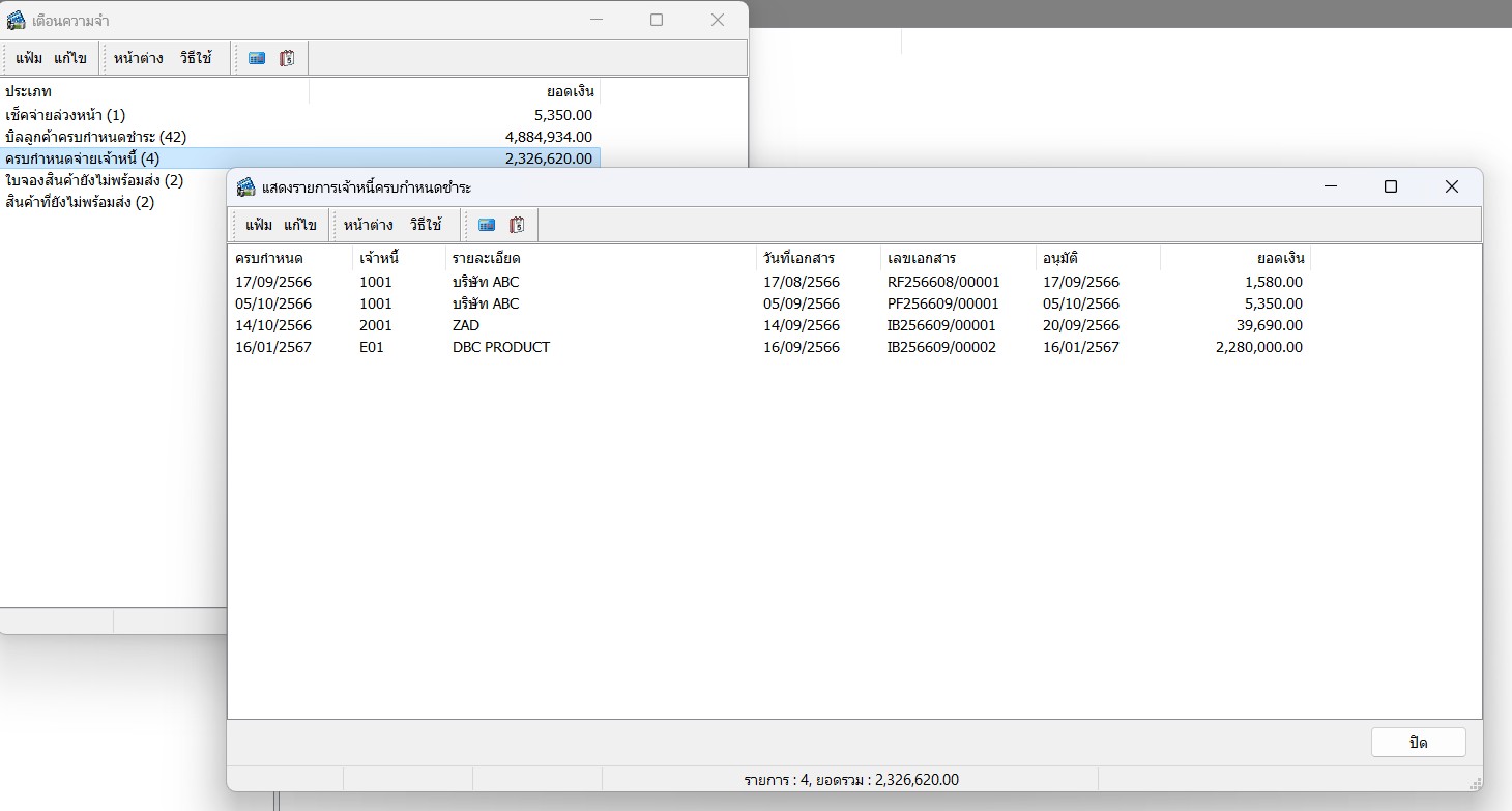 ตัวอย่างหน้าจอเตือนความจำ ครบกำหนดจ่ายเจ้าหนี้