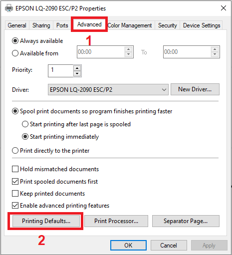 7.1 ระบบแสดงหน้าต่าง Properties กดเลือกแท็บ “Advance” จากนั้นกดปุ่ม “Printing Defaults”