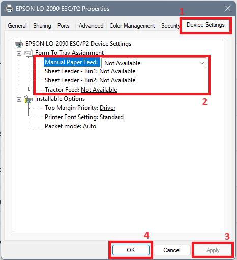ในส่วน Form to Tray Assignment ให้กำหนดค่า Manual Paper Feed, Sheet Feeder, Tractor Feed ให้เท่ากับ Not Available ดังภาพ