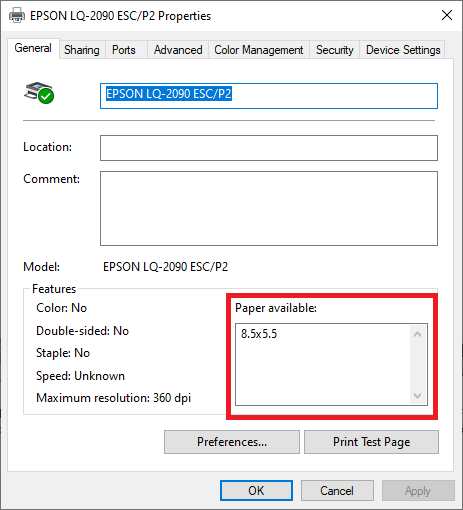 8. เมื่อตั้งค่าขนาดกระดาษให้กับเครื่องพิมพ์เรียบร้อยแล้ว สามารถตรวจสอบขนาดกระดาษจากหน้า Printer Properties ในส่วน Paper avaliable จะแสดงชื่อขนาดกระดาษ