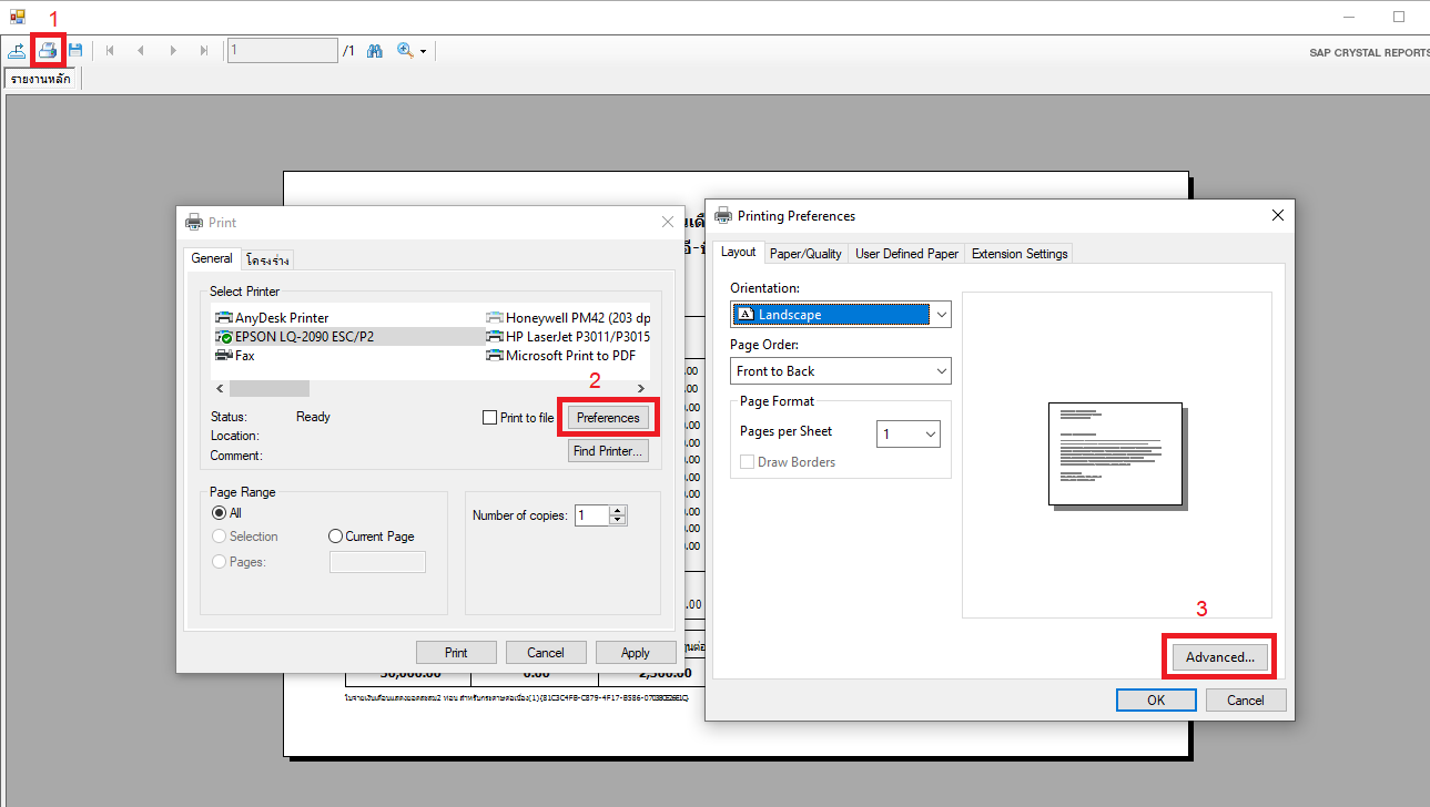 1. กดปุ่ม “เครื่องพิมพ์” ในหน้าแสดงตัวอย่างรายงาน
