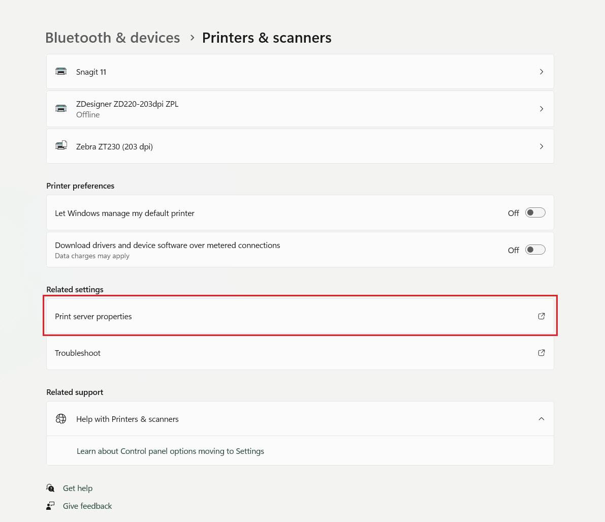 3. ในส่วน Related setting คลิกเลือก “Print server properties”